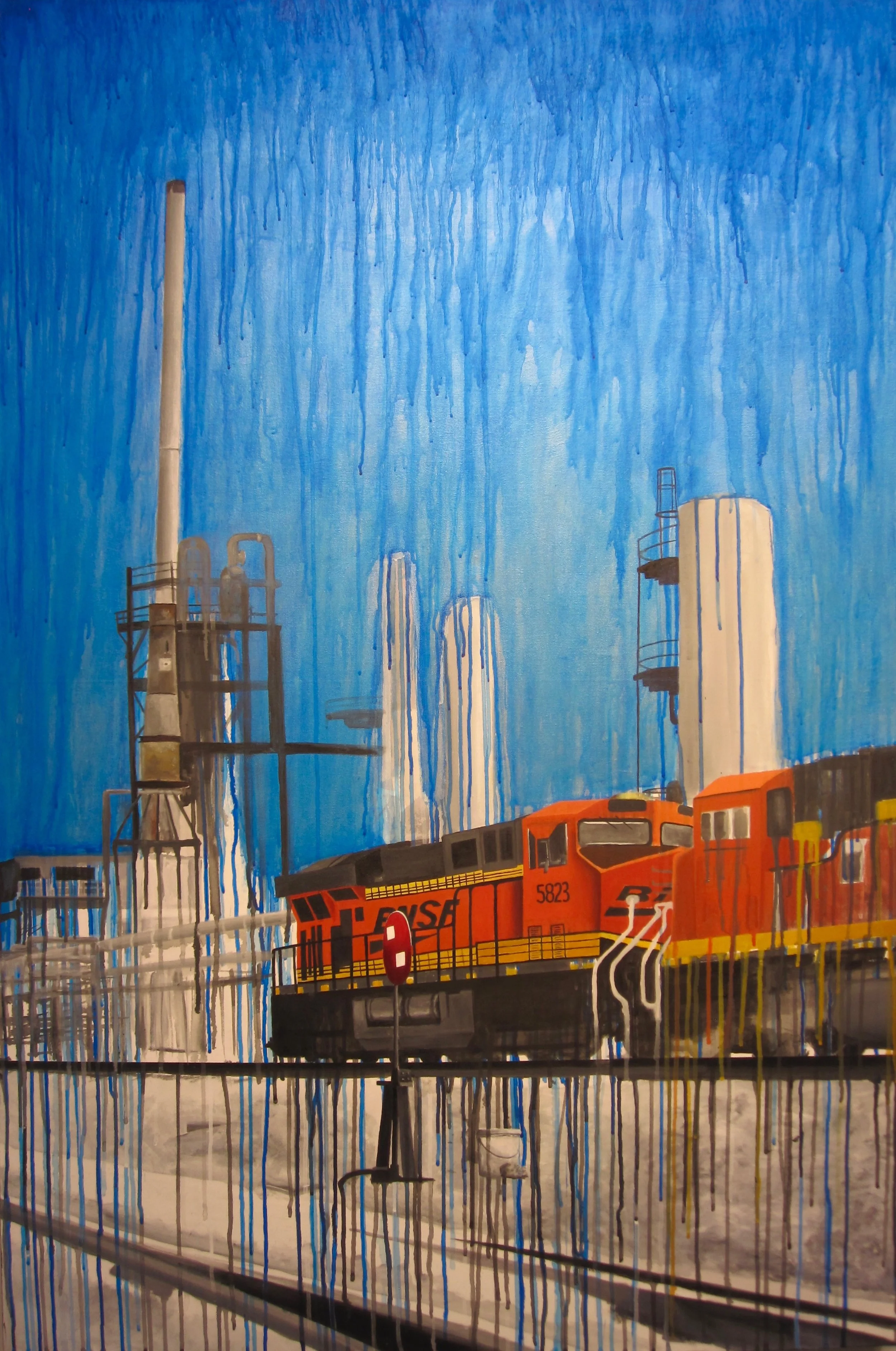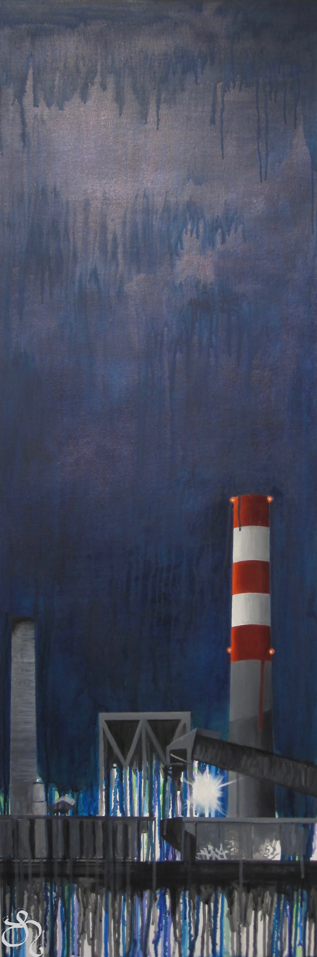 The buildings are relics of a previous period, reflecting on post-industry in Denver and Commerce City. Portrait of an Industrial Landscape explores contemporary theory and aesthetics conveying the change of time. These edifices are perceived as a monument to the antiquated resource I hope people will one day no longer depend on. It is a mystery what Denver will look like in the future, especially given its current rate of rapid growth. It is uncertain whether these structures will remain part of the future landscape. These paintings serve as a snapshot of the fascinating contrast between the archaic beauty of these structures and the public demand for an alternative energy source as well as a reminder to future generations about the consequences of using carbon-based energy as a way to sustain human existence.